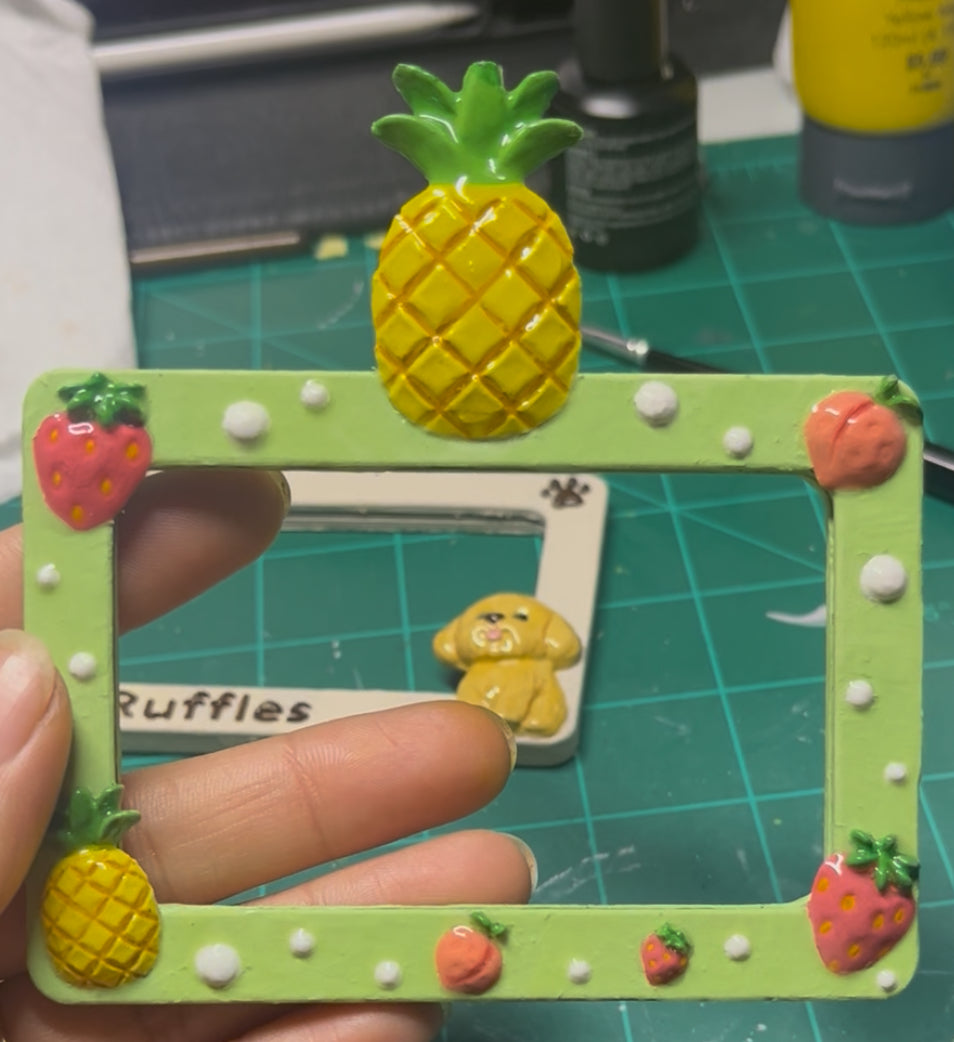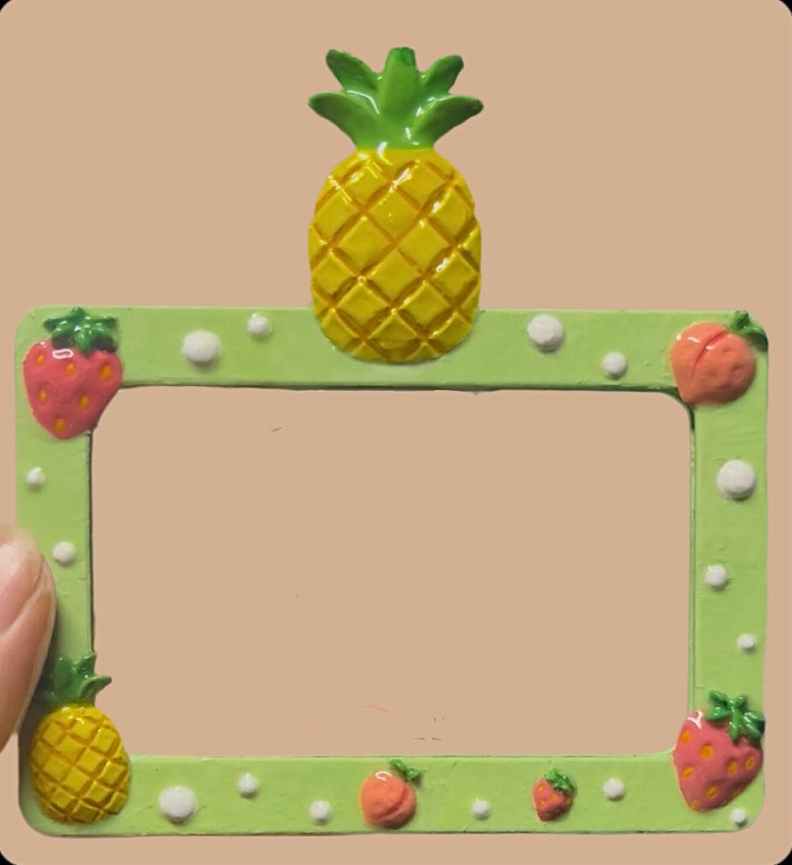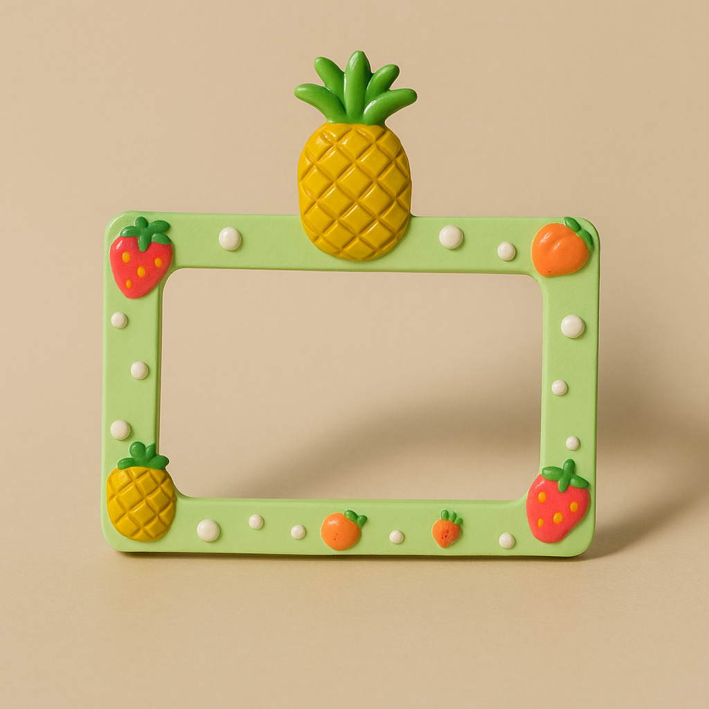 - Design: Light green frame with 3D fruit accents (pineapple, strawberry, peach)