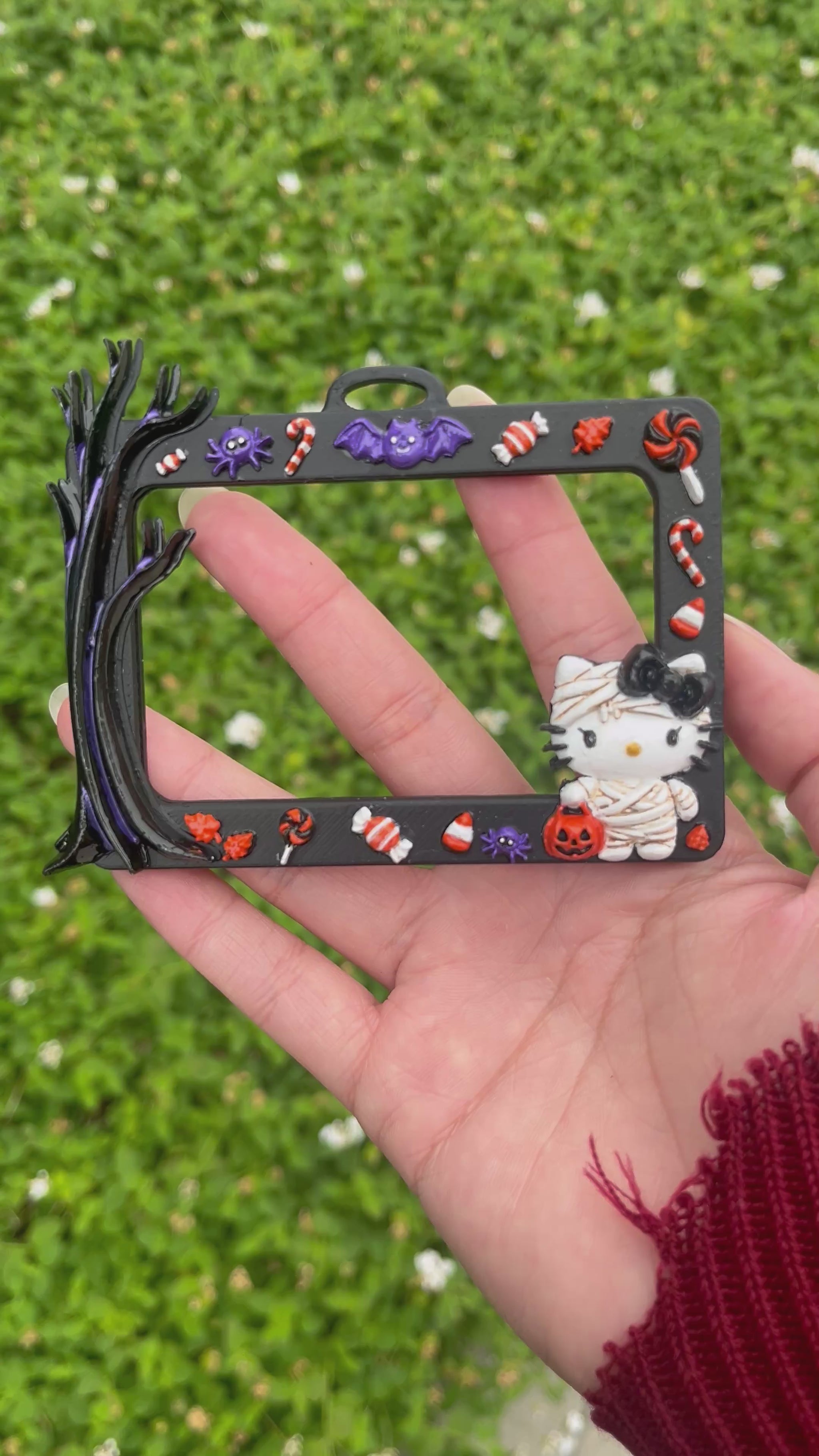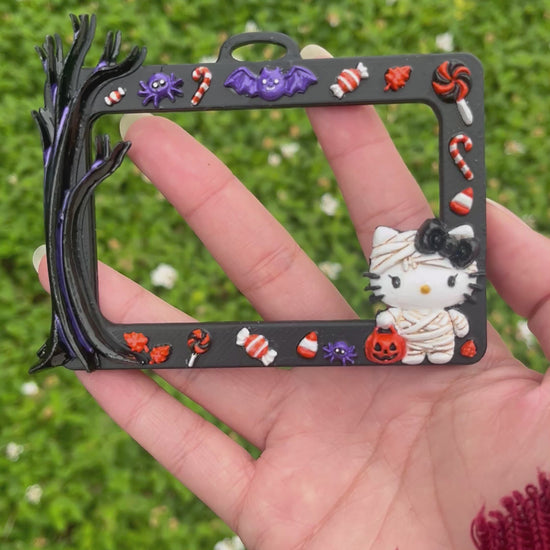Add a touch of Halloween magic to your everyday outfit with this handcrafted Halloween-themed badge holder! Featuring a playful Hello Kitty dressed as a mummy, holding a tiny jack-o’-lantern, this frame is decorated with creepy-cute details: candy corn, lollipops, bats, spiders, and a spooky tree.