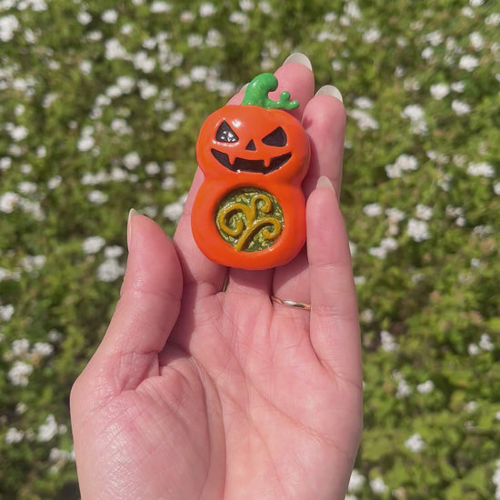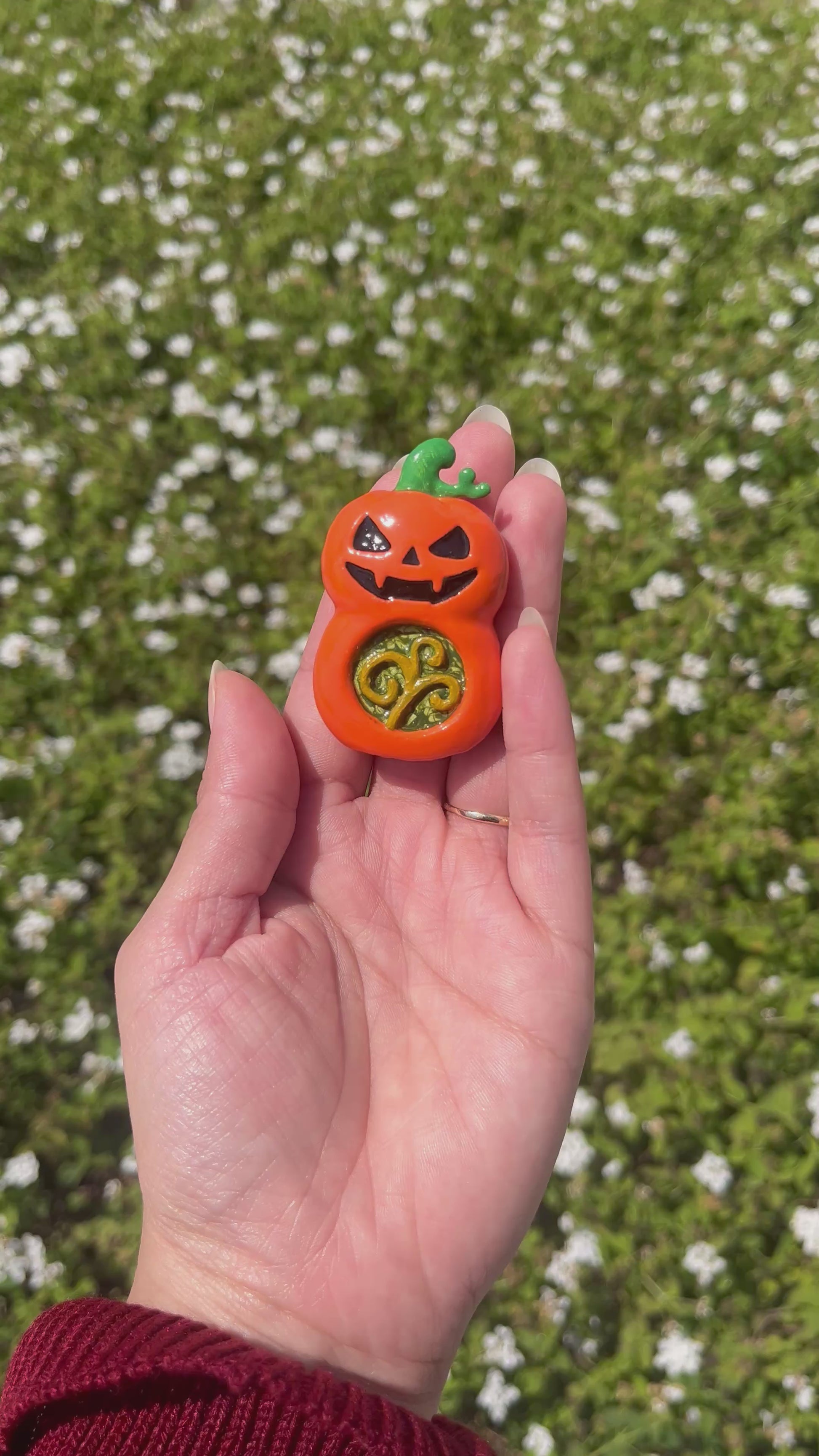 Bring a little spooky charm and calming energy into your pocket with this handcrafted pumpkin worry stone. Designed in a playful jack-o’-lantern shape with a bright orange finish, this worry stone features a smooth thumb divot for stress relief and grounding. The carved green swirl detail adds a magical touch, making it both fun and functional.