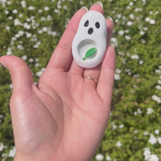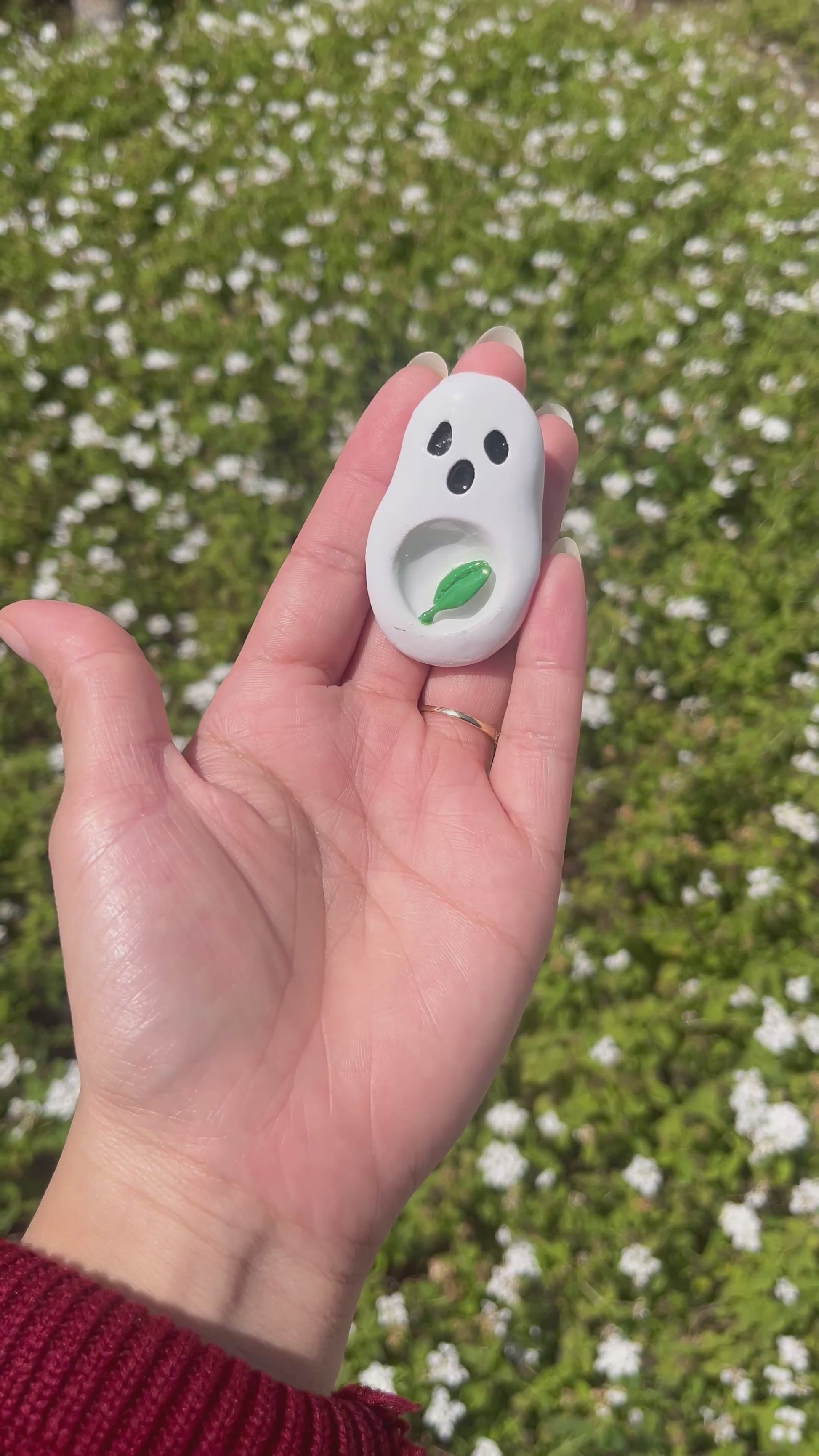 Add a little spooky fun to your self-care routine with this handmade ghost worry stone. Designed with a sweet ghostly face and a smooth thumb divot for calming fidget relief, this piece is both playful and functional. A small green leaf detail adds a unique and whimsical touch.
