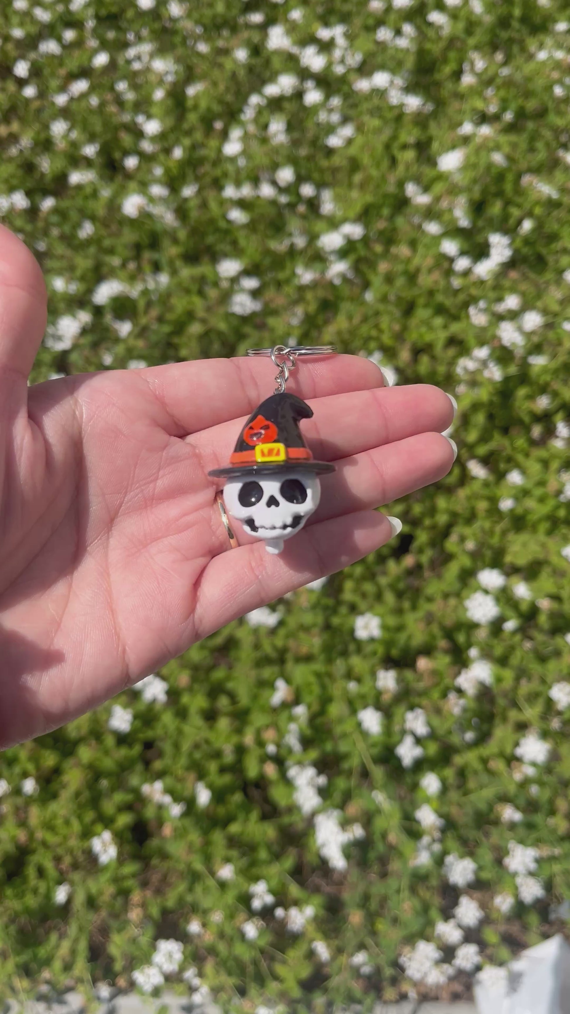 Celebrate spooky season in style with this handcrafted Halloween skull charm! Featuring a smiling skull wearing a festive black witch hat decorated with a tiny jack-o’-lantern, this charm is both creepy and cute. Each piece is carefully hand-painted, making it a unique little accessory for Halloween lovers.