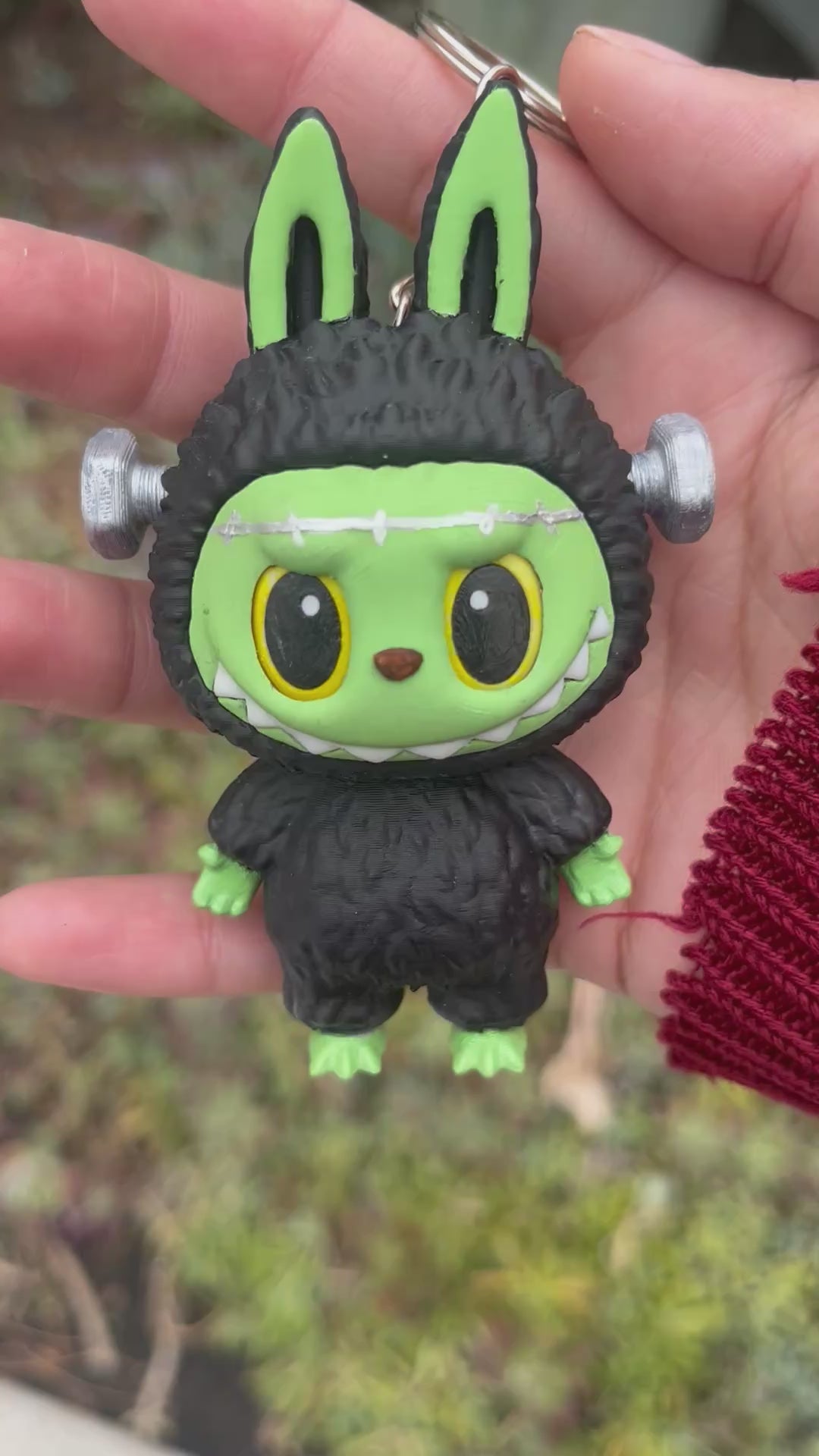 Bring a spooky-cute vibe everywhere you go with this Frankenstein keychain! This adorable figure features a bright green face with stitched details, big yellow-outlined eyes, and a wide stitched grin full of tiny teeth. Its fuzzy-textured black suit, tall green-and-black ears, and silver bolts on the sides of its head give it a playful Frankenstein-inspired twist.